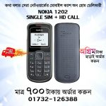 নোকিয়া ১২০২ এক সিমের একটি মোবাইল। এই মোবাইল এর চার্জ বেকাপ ২ থেকে ৩ দিন পর্যন্ত থাকে। নোকিয়া ১২০২ মোবাইল এ ইমোজি দিয়ে নাম্বার সেভ করা যায়। এক কথায় খুব অসাধারন এক ছোট বার ফোন যা সকলের নজর কাড়বে। এই মোবাইল ছোট্ট কিউট সাইজ এর যার ফলে সকলের মায়ার এক ফোনের নাম নোকিয়া ১২০২ বার ফোন।