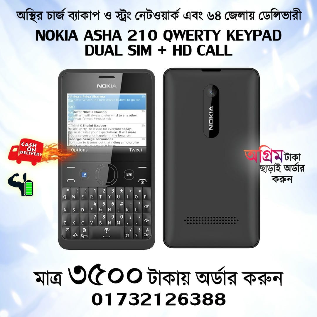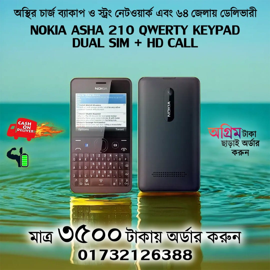 নোকিয়া Asha 210 ইউনিক মোবাইল কথা বলার জন্য এবং রাফ ইউজ এর জন্য। এতে কম্পিটার কিবোর্ড এর মতো অনেক গুলা বাটন আছে যা বলা হয় Qwerty Keypad. নিসন্দেহে এটি ইউনিক গরজিয়াস লুকিং এর একটা ফোন। এতে দুই সিম সাপোর্ট করে এবং একসময় বিশ্ব কাপানো সেট ছিলো এটি। নোকিয়া আশা ২১০ আমাদের স্টকে অরিজিনাল রিফার্বিশড কন্ডিশন এর রয়েছে।